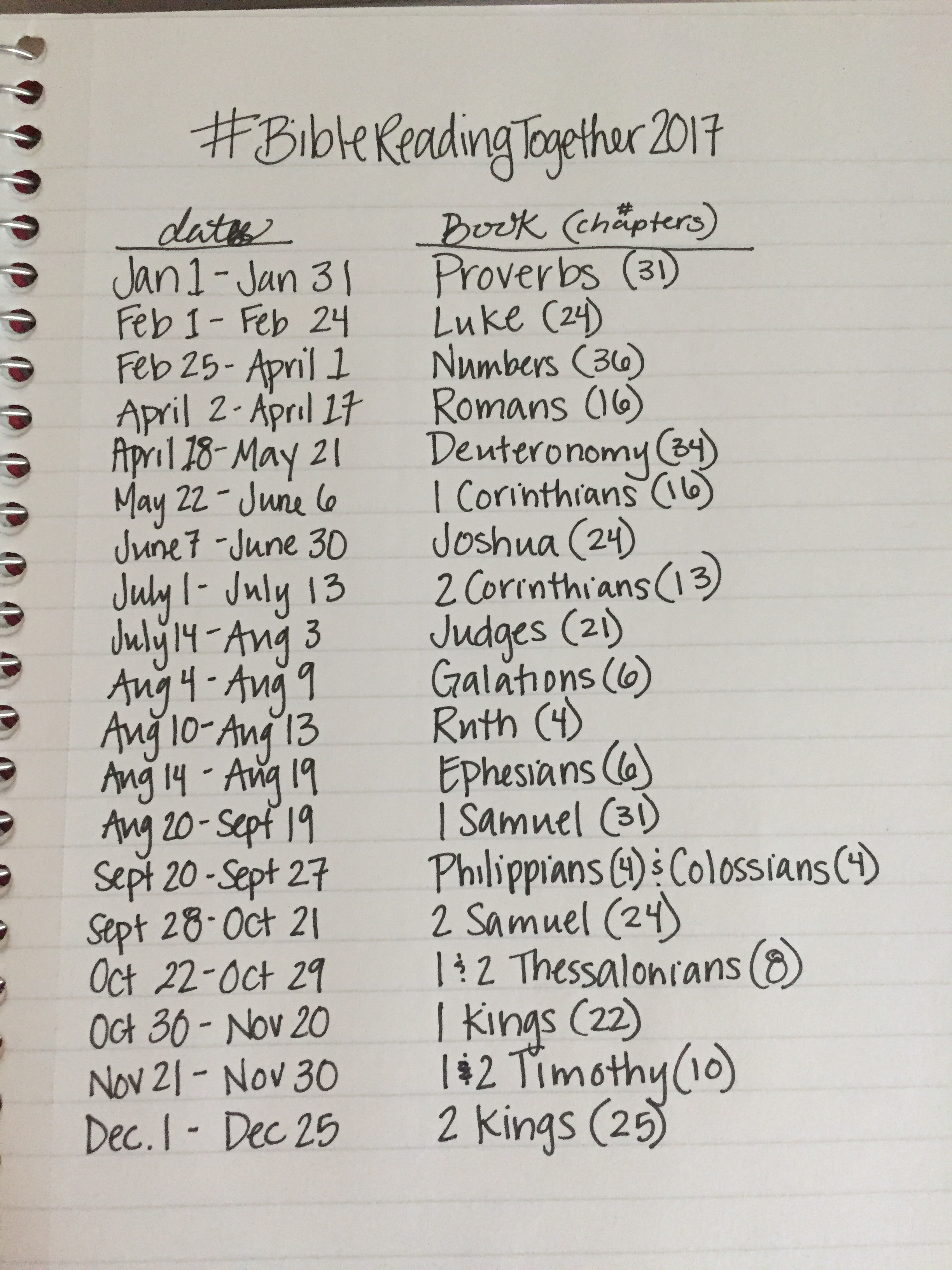 This year’s plan is similar to most my plans where we’ll go back and forth from the Old Testament to the New Testament. There’s no real rhyme or reason except that I chose books that I haven’t read since getting my new journaling Bible. I have it planned so that we’ll read one chapter a day. In the picture you’ll see the start and end date for each book.